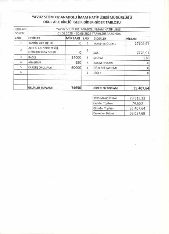 OKUL AİLE BİRLİĞİ 01.06.2025- 30.06.2025 TARİHLERİ ARASI GELİR /...